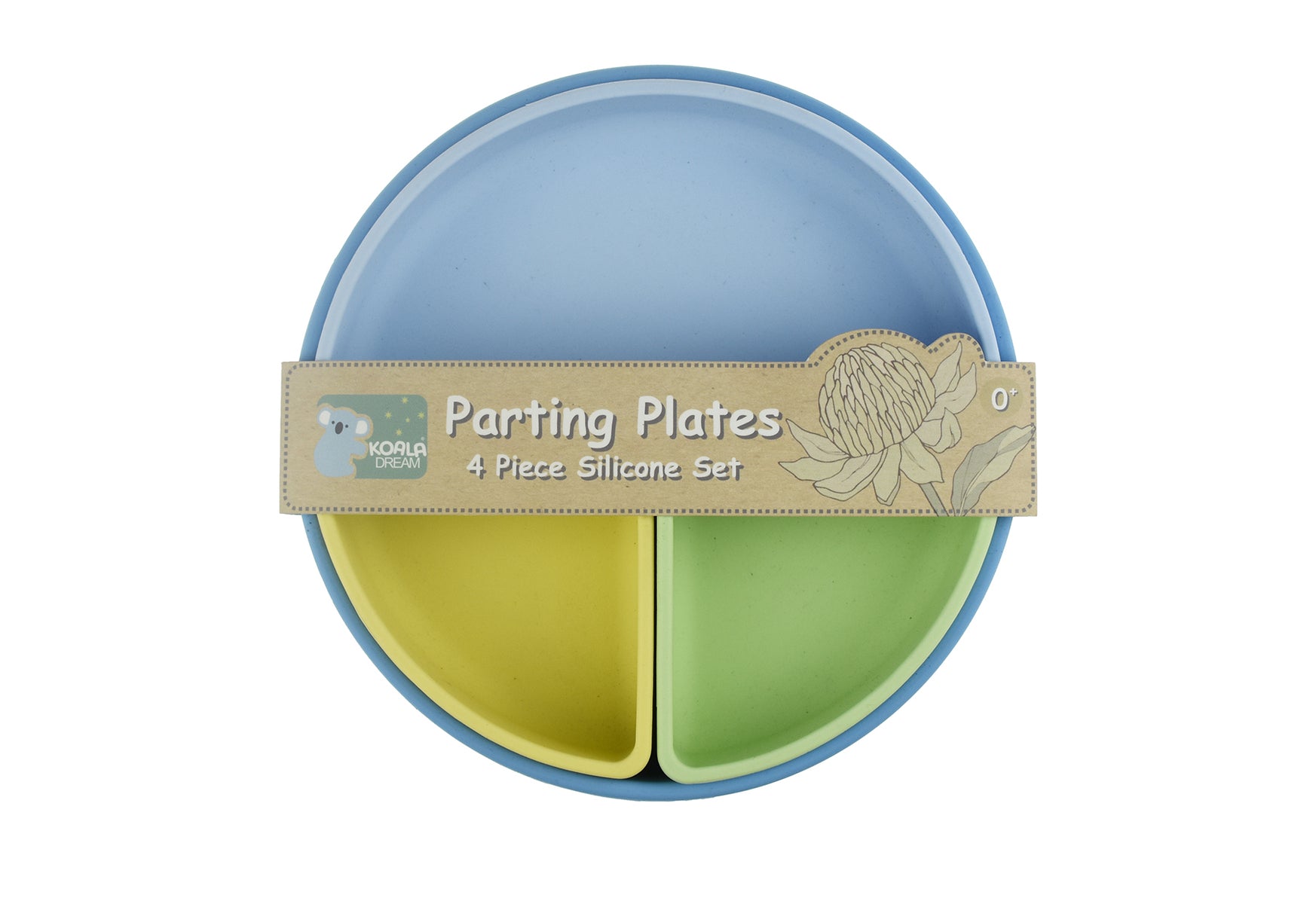 The Silicone Parting Plates from Koala Dream offer a versatile and convenient solution for mealtime. This 4-piece set includes a suction cup base plate and three plates that nestle within, creating a half and two quarters.