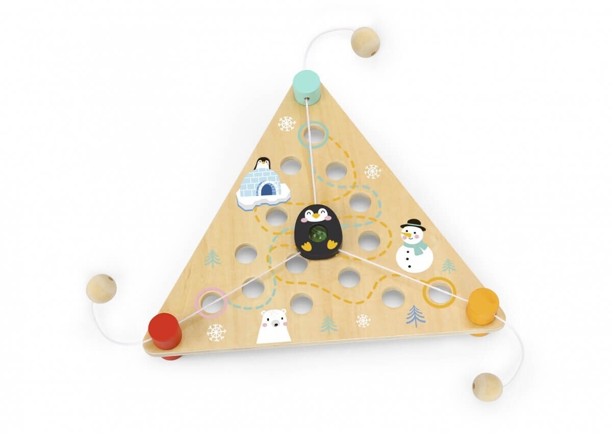 Place a marble on the belly of the Penguin and gently try and manoeuvre the penguin around the board by pulling on the strings on either corner of the triangle. Follow the dashes to get your Penguin to a corner or create your own path, but, move gently because if you pull too far your marble might fall off the Penguin and into a hole. If it falls, you'll have to start again.
